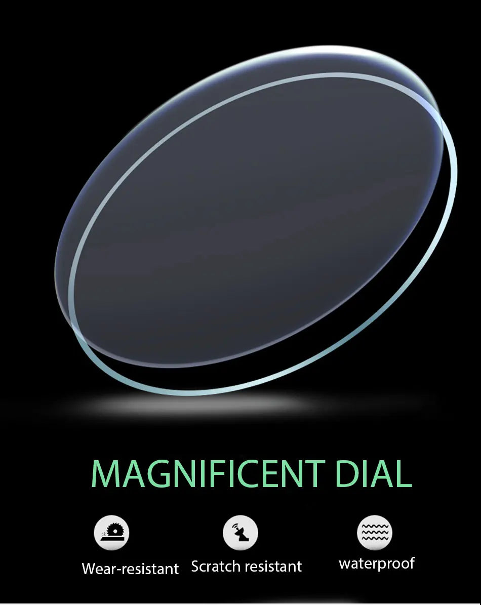• Hardlex dial window material type:The dial window is made of Hardlex, a type of mineral crystal that is scratch-resistant and highly durable.